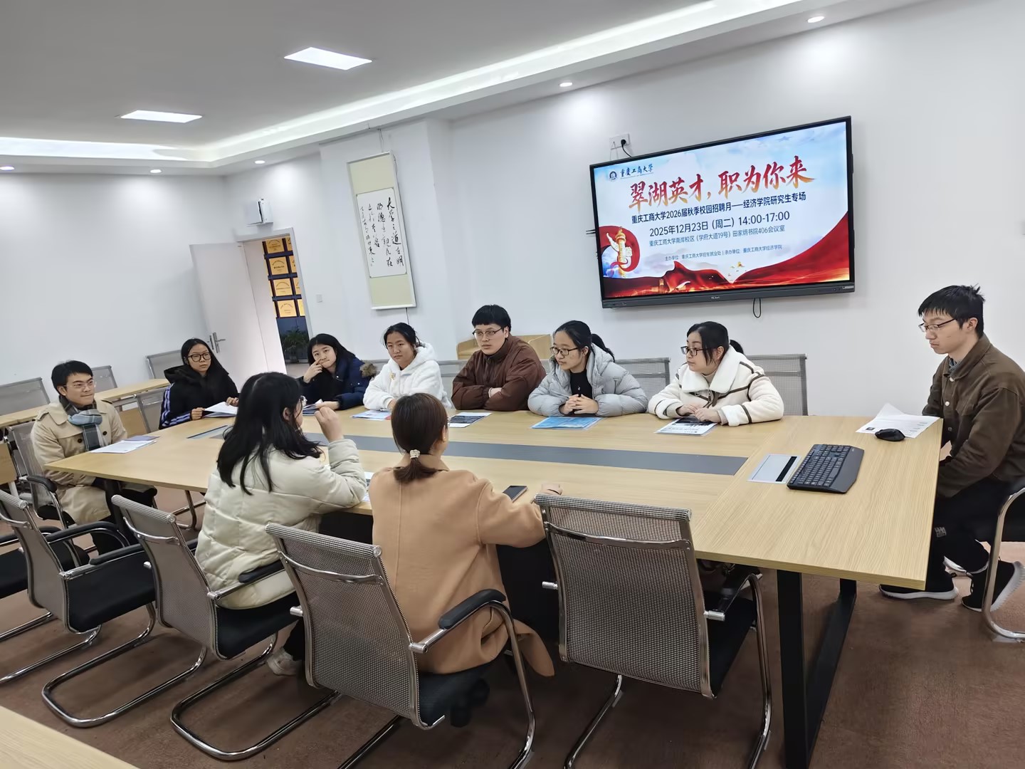 为进一步助力毕业生考研后求职,12月23日,经济学院在田家炳书院409报告厅成功举办2026届毕业生专场双选会,吸引50余家知名企业携超1000个岗位进校招聘,助推毕业生就业。