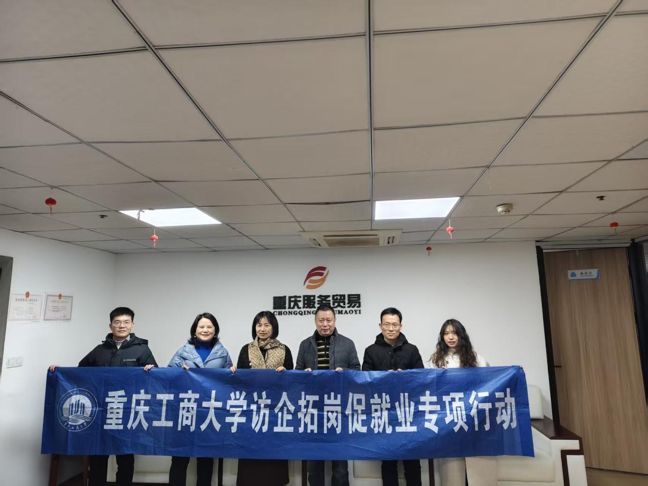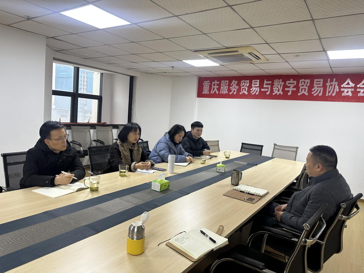 2026年1月4日,重庆工商大学经济学院院长宋瑛教授率队赴重庆服务贸易与数字贸易协会开展合作交流座谈和访企拓岗活动。国贸系主任蒋兴红、副主任万述林及王春豪副教授随行,协会钟伟会长热情接待并主持座谈。双方聚焦重庆中小企业出海痛点难点,立足校协优势互补,就深化政产学研协同、赋能区域外贸高质量发展达成系列合作共识。