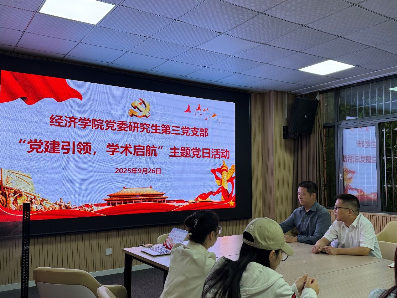 2025年9月26日,经济学院党委研究生第三党支部在田家炳书院102会议室开展“党建引领,学术启航”支部进翠湖书院党日活动暨9月组织生活,经济学院党委委员、成渝地区双城经济圈建设研究院副院长黄潇到会指导,会议由支部书记刘晗主持。