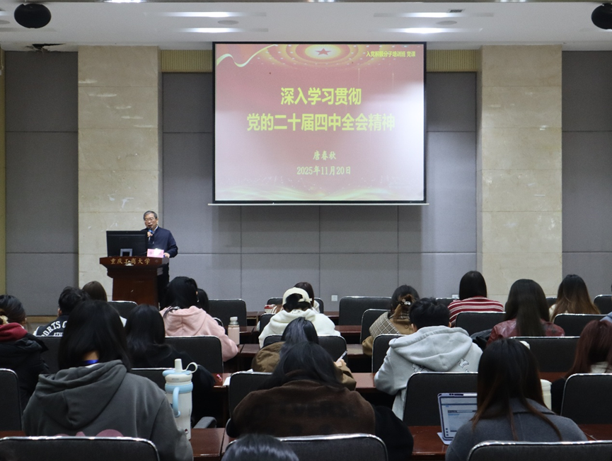 为深化入党积极分子对党的认识,夯实理论基础,端正入党动机,11月20日至23日,经济学院、金融学院分党校在南岸校区田家炳书院409报告厅和博智楼07308教室成功举办2025年第二期入党积极分子培训班。经济学院党委书记唐春秋、学校党政办公室秘书科科长罗勇、金融学院学生党支部书记杨宁、学团办主任兰丽娟、经济学院学生党支部书记喻智成、文理为同学们授课,来自经济学院和金融学院的130余名入党积极分子参加了此次培训。在为期三天的培训中,课程内容丰富、系统全面。开班仪式结束后,唐春秋以“深入学习贯彻党的二十届四中全会精神”为题进行专题授课,为整个培训奠定了坚实的理论基础。