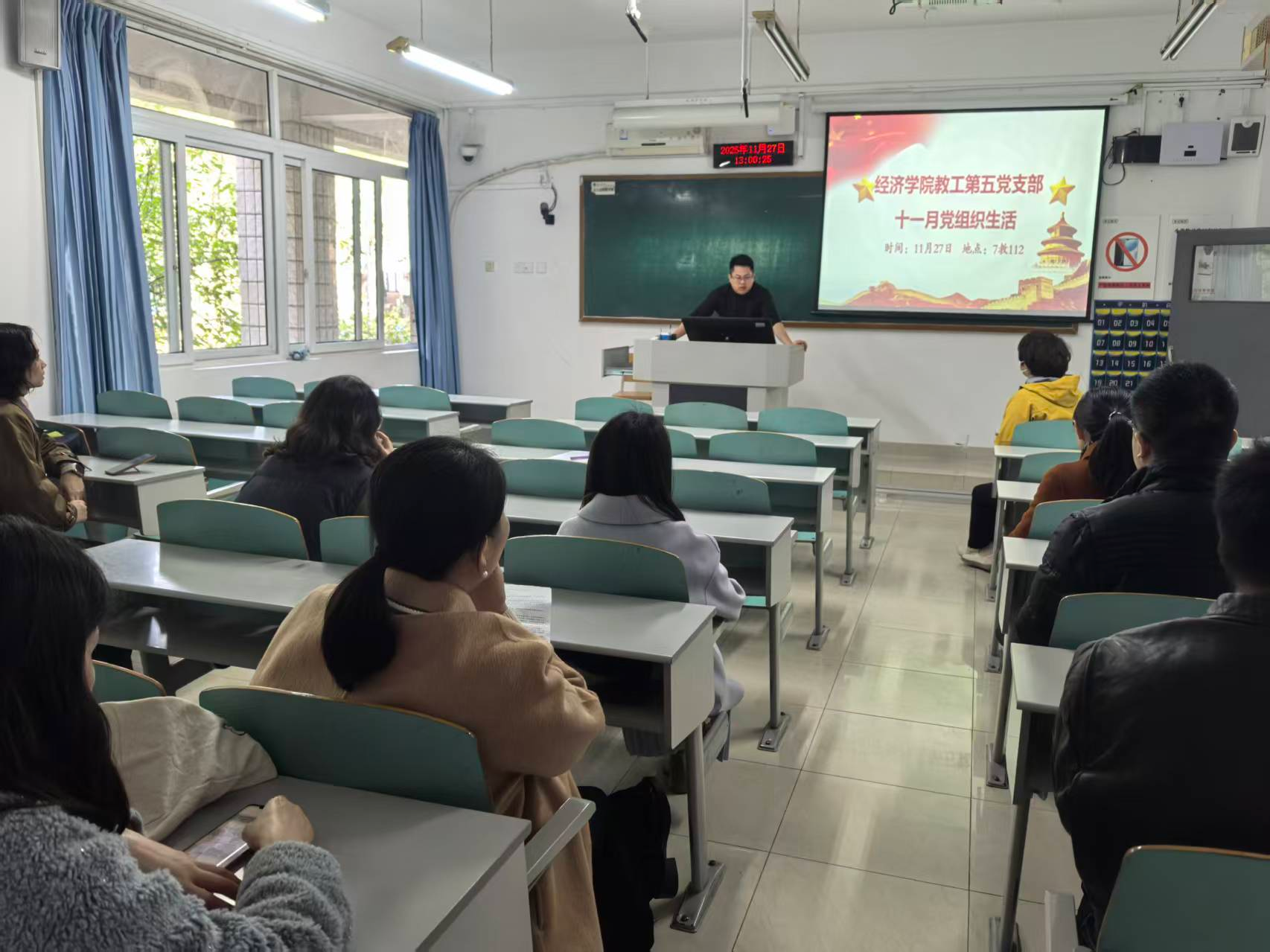 2025年11月27日下午,经济学院教工第五党支部在七教112教室开展了11月党组织生活。会议以集中学习“党的二十届四中全会”精神为核心主题,全程由支部书记林黎主持,全体党员参会。