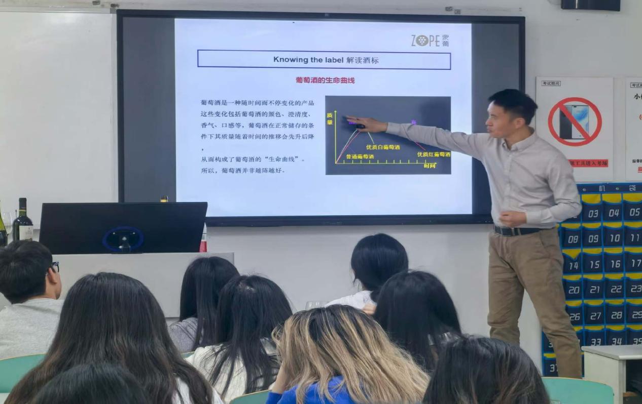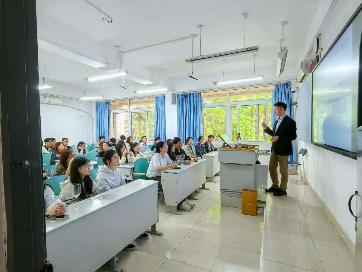 为深化贸易经济专业商品学课程教学内涵,拓宽学生专业知识面,提升实践品鉴能力与商务文化素养,2026年4月15日,24级贸易经济一班开展了一场别开生面的葡萄酒品鉴专题拓展课。本次课程由贸经系主任杨海丽老师特邀行业专家主讲,主讲人为众葡(重庆)酒业总经理、众葡(重庆)葡萄酒学院院长安易老师,他同时也是英国葡萄酒与烈酒基金协会(WSET)高级品酒师、协会成员。安易老师凭借幽默风趣、与时俱进的授课风格,将专业知识与行业经验结合,为同学们带来了一堂干货满满、氛围热烈的课程,深受全体学生喜爱。