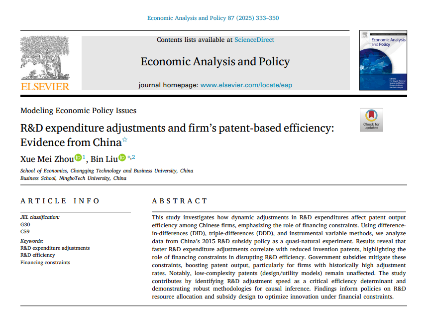 2025年9月,经济学院周雪梅老师以第一作者在SSCI 2区TOP、JCR 1区经济类期刊《Economic Analysis and Policy》发表题为《R&D expenditure adjustments and firm’s patent-based efficiency: Evidence from China》的论文。