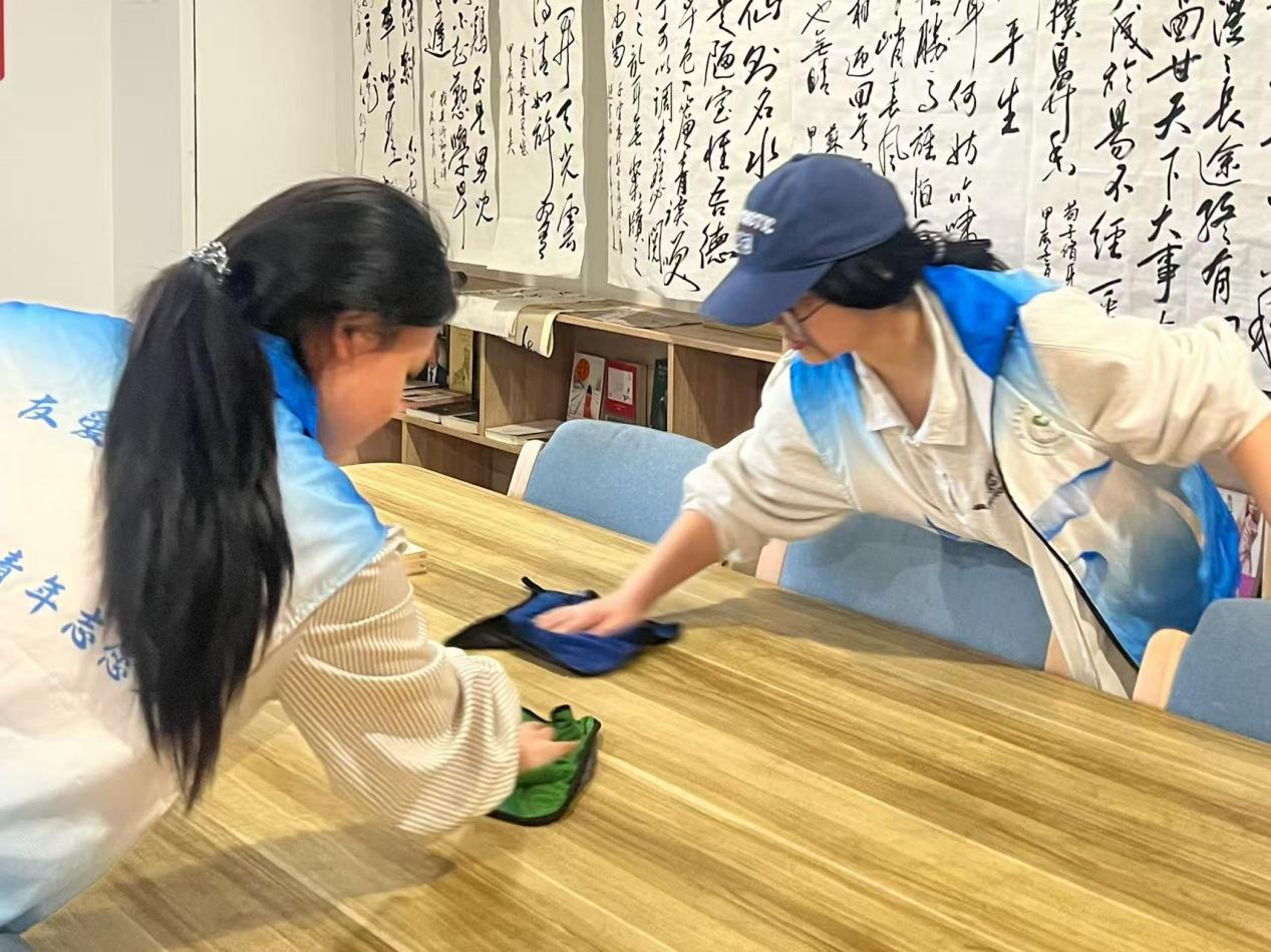 活动中,志愿者与老人亲切交谈,细致询问其健康状况与生活需求,传递温暖关怀;同时与工作人员对接,明确服务站清洁规范。随后,团队分工协作:一组负责地面清扫、桌椅擦拭,并归置水杯、老花镜等物品;另一组清洁门窗、书柜,按老人阅读习惯整理书籍。经过一个多小时的细致劳作,养老服务站内窗明几净,物品摆放井然有序,整体环境得到有效改善。看着焕然一新的居住环境,老人们纷纷对志愿者的辛勤付出表示感谢,脸上露出了欣慰的笑容。